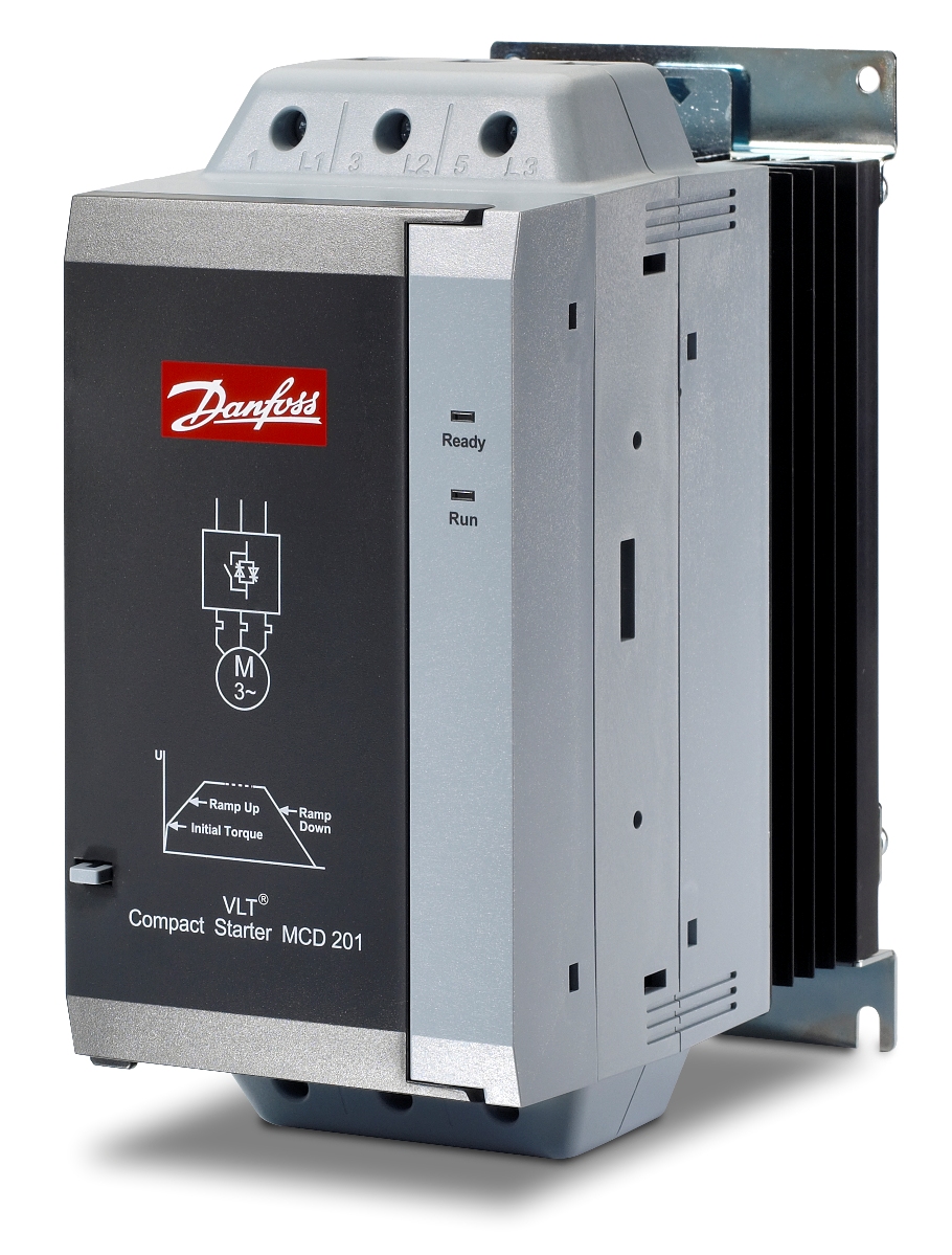 VLT® MCD 201 — устройство плавного пуска для асинхронных электродвигателей. Данное устройство принадлежит серии MCD 200, не имеет встроенных датчиков тока и регулирует напряжение двигателя по заранее заданному закону.В MCD 201 встроен обходной контактор, что упрощает проектирование системы управления двигателем и экономит место при монтаже.Управление пуском и остановом двигателя возможно только посредством дискретных входов по 2-х или 3-х проводной схеме либо через последовательную связь.Настройка MCD 201 осуществляется посредством переключателей, размещенных на лицевой панели.Основные характеристики VLT® MCD 201